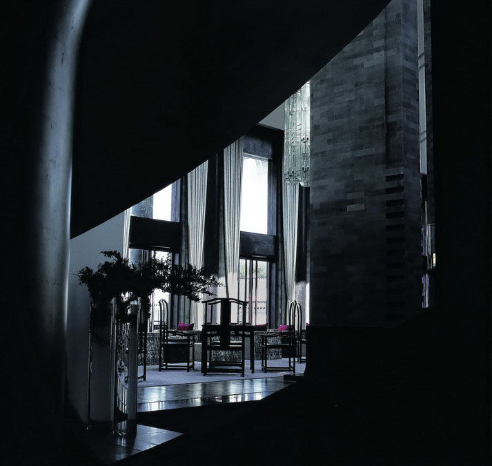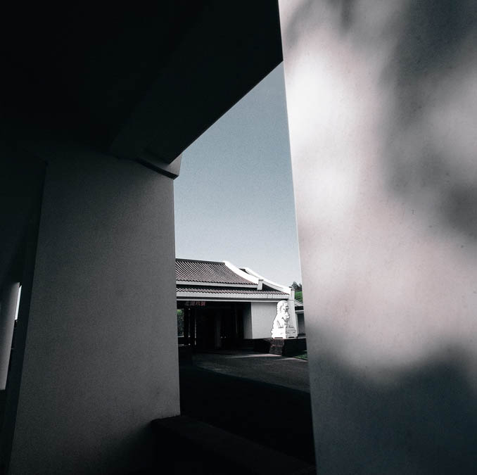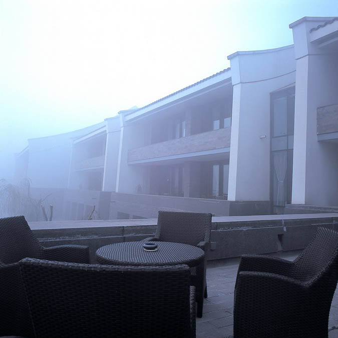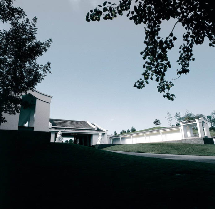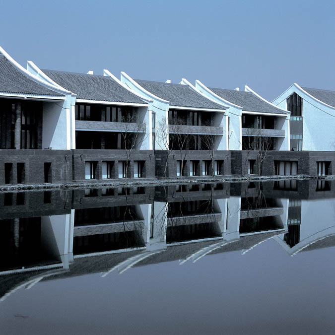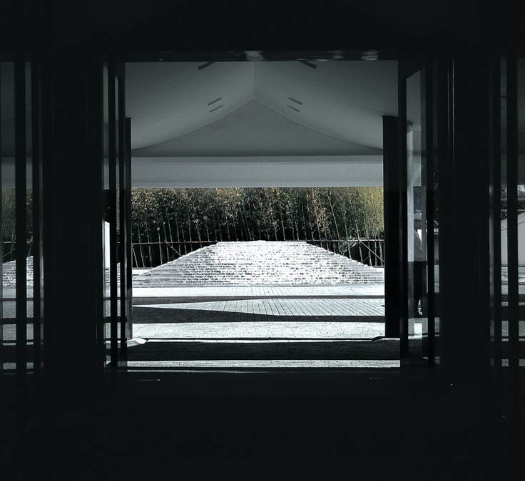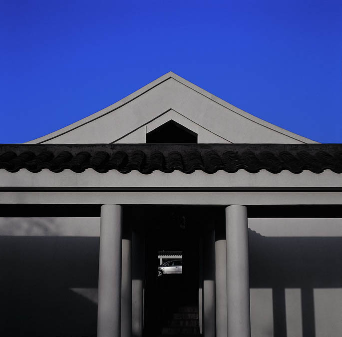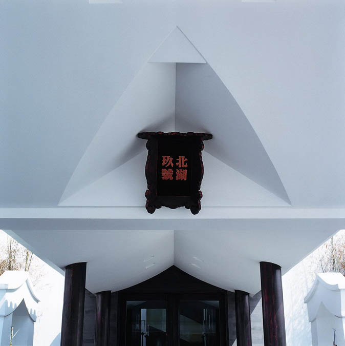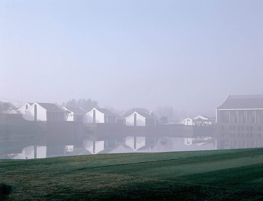 立会馆前广场中心东望,湖光如镜,湖边粉墙灰瓦别墅几幢,房前屋后绿树掩映,并果岭青茵映入湖中,看朝阳初起,入步仙境蓬莱.会馆广场西看,一碑亭居中,亭东亭西便是洗体池各一,净水映亭,亭中碑铭天仙圣母庙庙起因源,道教道理便是自湖东果岭西望,会馆如卧龙临波,虚实相间,层层叠叠,看湖中水佩风来,仙气弥漫,此景只应天上有.是夜,华灯初上,穹光膳堂的烛光,带着几许迷幻,散落湖面,若卧龙初醒,活灵活现.会馆尚水,得源东湖,以动奔穹光膳堂而去,落入洗尘阁前水禁.湖水之静,直取听雨廊西行,在馆前场留静水一池,鉴天洞地正当其中,又西去与会馆大门楼内庭汇出镜池四面,端端正正,中规中矩,是道中四理,再西去车辇场,碑亭东西洗体池,出车辇场西门进入政务院[无影方](玻璃会议室),周围环顾,轻举无影方于其中, 每至冬令, 雪后夕阳, 水气引地温泉而满溢, 自亦仙亦道, 凭空蒸发, 个中皆是理、是意、是情、是趣, 风来无语, 动容生气, 仙自若定, 神自若行, 皆非凡力. 会馆, 形取帝王宫阙之宏制, 意得江南民居庭院之趣.隽永文质,大气而更得精致,青砖灰瓦、粉墙白壁, 缘起视界黑白与空色的修炼, 碧水蓝天、青禾绿植,消息一派生机,秋风瑟瑟,大地萧萧,唯白墙高屋、灰瓦平楼,暮天中是形,也是灰为黑白,似无色,却意在万千,冬去春行,午后斜阳,花影、树印、云影、山形尽写于粉墙, 斜阳西移,篁影东行,只是神仙识此图.