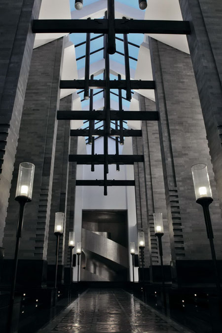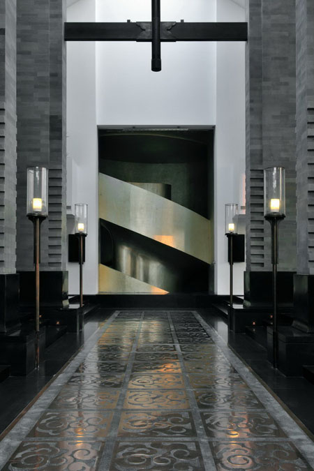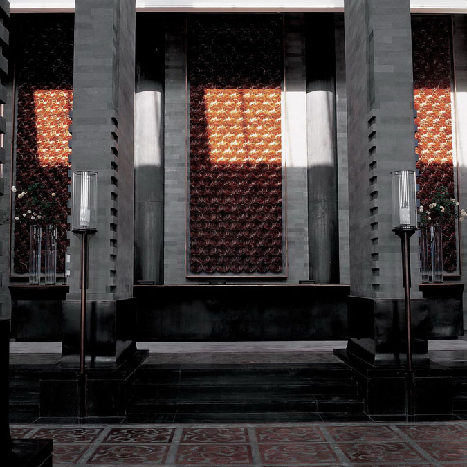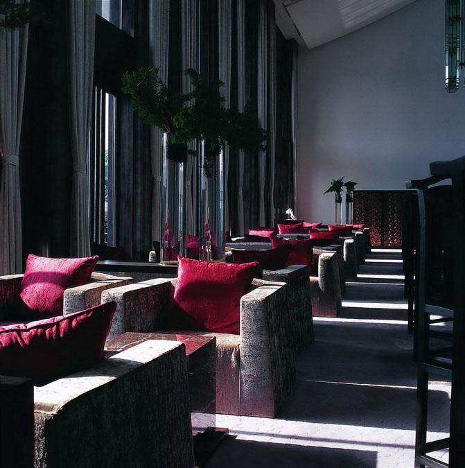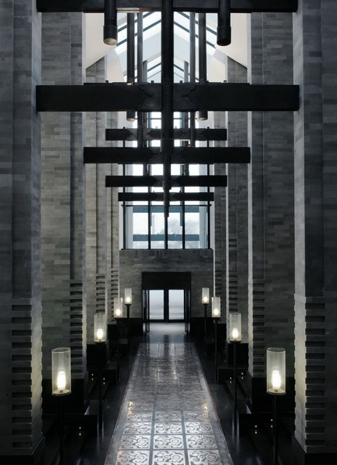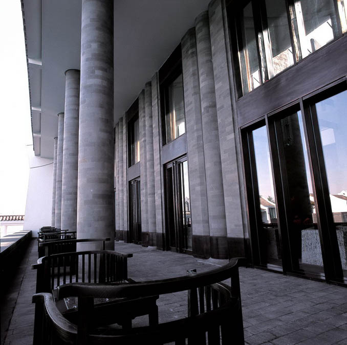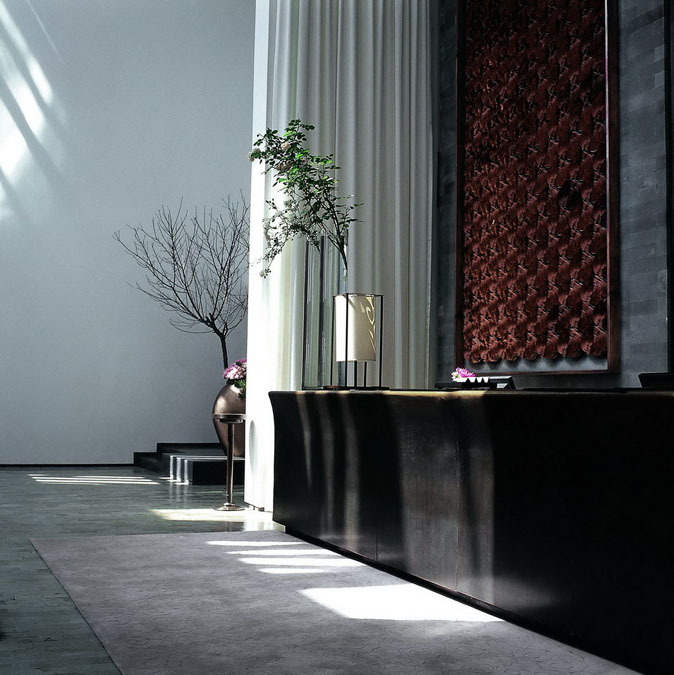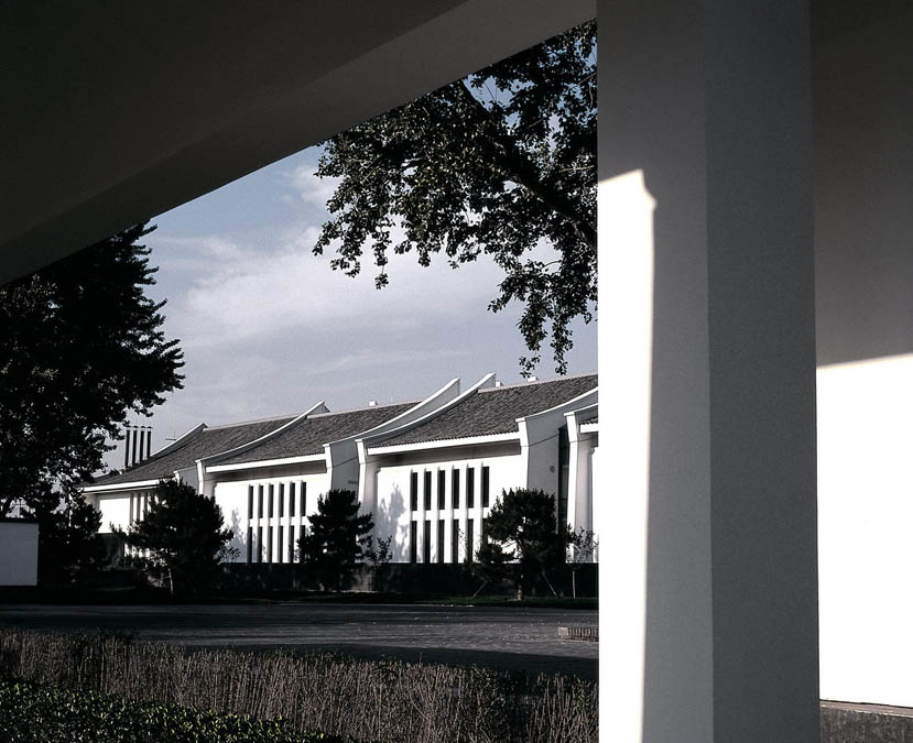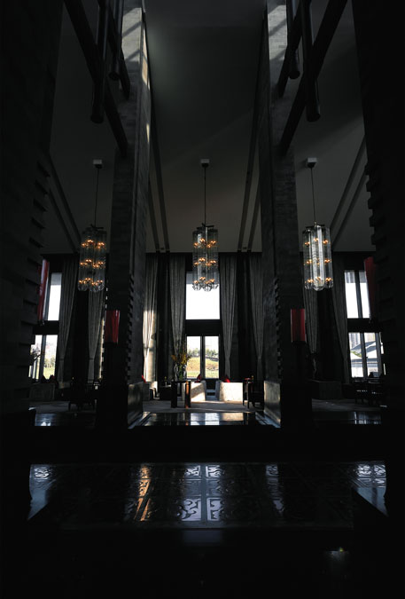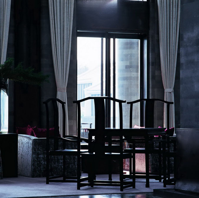 立会馆前广场中心东望,湖光如镜,湖边粉墙灰瓦别墅几幢,房前屋后绿树掩映,并果岭青茵映入湖中,看朝阳初起,入步仙境蓬莱.会馆广场西看,一碑亭居中,亭东亭西便是洗体池各一,净水映亭,亭中碑铭天仙圣母庙庙起因源,道教道理便是自湖东果岭西望,会馆如卧龙临波,虚实相间,层层叠叠,看湖中水佩风来,仙气弥漫,此景只应天上有.是夜,华灯初上,穹光膳堂的烛光,带着几许迷幻,散落湖面,若卧龙初醒,活灵活现.会馆尚水,得源东湖,以动奔穹光膳堂而去,落入洗尘阁前水禁.湖水之静,直取听雨廊西行,在馆前场留静水一池,鉴天洞地正当其中,又西去与会馆大门楼内庭汇出镜池四面,端端正正,中规中矩,是道中四理,再西去车辇场,碑亭东西洗体池,出车辇场西门进入政务院[无影方](玻璃会议室),周围环顾,轻举无影方于其中, 每至冬令, 雪后夕阳, 水气引地温泉而满溢, 自亦仙亦道, 凭空蒸发, 个中皆是理、是意、是情、是趣, 风来无语, 动容生气, 仙自若定, 神自若行, 皆非凡力. 会馆, 形取帝王宫阙之宏制, 意得江南民居庭院之趣.隽永文质,大气而更得精致,青砖灰瓦、粉墙白壁, 缘起视界黑白与空色的修炼, 碧水蓝天、青禾绿植,消息一派生机,秋风瑟瑟,大地萧萧,唯白墙高屋、灰瓦平楼,暮天中是形,也是灰为黑白,似无色,却意在万千,冬去春行,午后斜阳,花影、树印、云影、山形尽写于粉墙, 斜阳西移,篁影东行,只是神仙识此图.